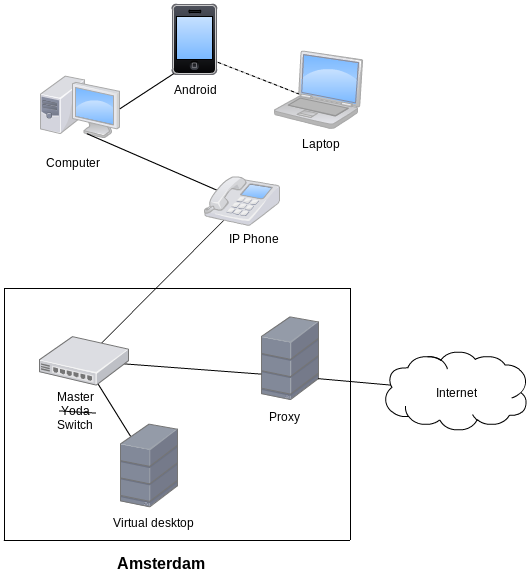 Hooking just my laptop up to the IP phone was easy enough, and after setting some proxy settings I could use most things on the web (except some programs incompatible with authenticated proxies). But what about my computer? I got a virtual desktop on a server in Amsterdam with my development environment; I couldn't get any work done without network connectivity on my computer. It would also be nice if the computer could exchange files with my laptop since I had no Microsoft Visio on the computer (could have requested it, but it's such a pain when you have the program right here on your laptop).