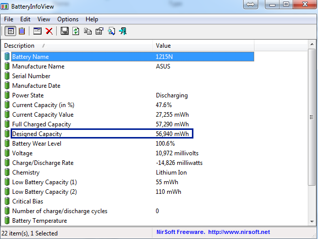 On Windows you have to install an application like NirSoft BatteryInfoView (direct download). After downloading and opening it, you probably get a screen like this: